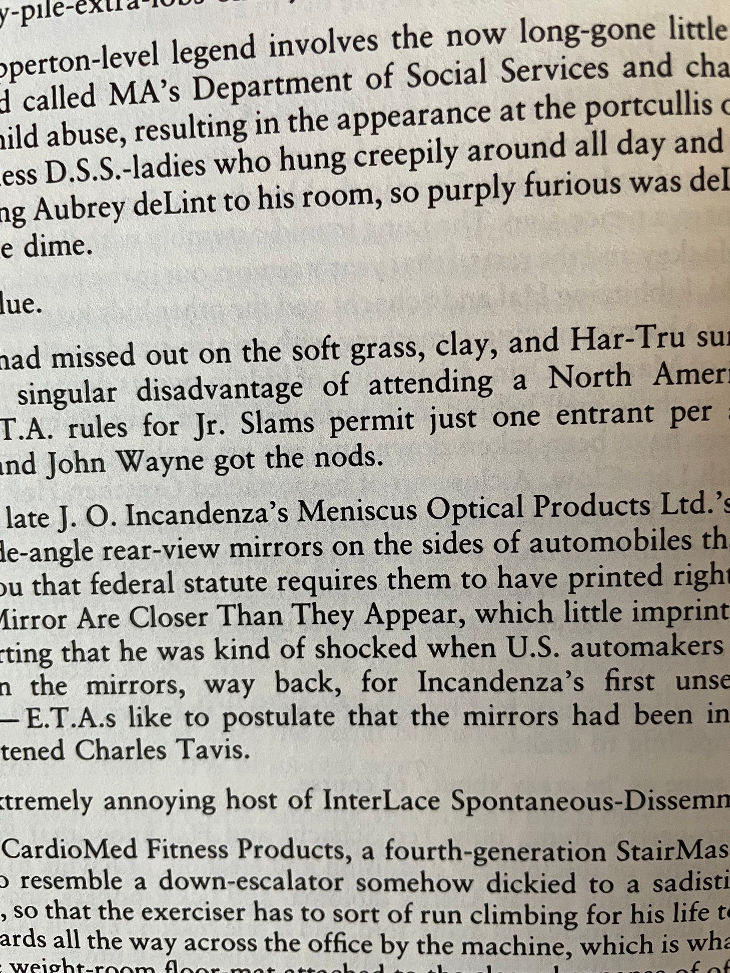 Some of my writer friends hate this book, saying that Wallace’s snobbery is mean and it’s definitely on full display in this collection. And his father disputes some of the facts that Wallace relies on in his account of his tennis career in the Midwest (read D. T. Max’s biography of Wallace for some reflections on Wallace’s growing up and relationships) . Wallace also seems to be prone to projectile vomiting, which he does in several of these stories. So be forewarned: you might not like him much: he is pretty judge-y in this book, as he is in “Consider the Lobster.” And at least, with Infinite Jest, you can ignore those aspects of Wallace. But you can also give up on reading these books in their entirety without feeling bad about it.